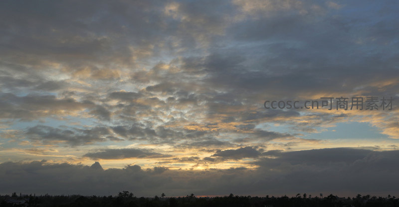 夕阳西下,金色光芒穿透层层云朵,将天空渲染成温暖的橙黄色调,地平线上的树影与云海相接,营造出静谧而壮丽的自然画卷。