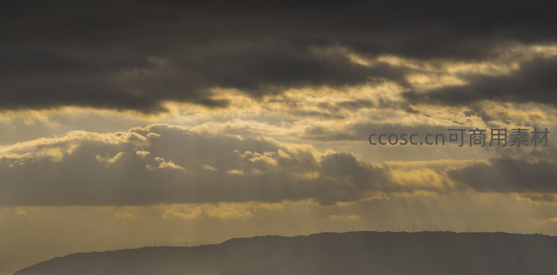 太阳透过云层缝隙倾泻下道道金光,映照在远处连绵山脉之上,形成强烈明暗对比的壮美画面。