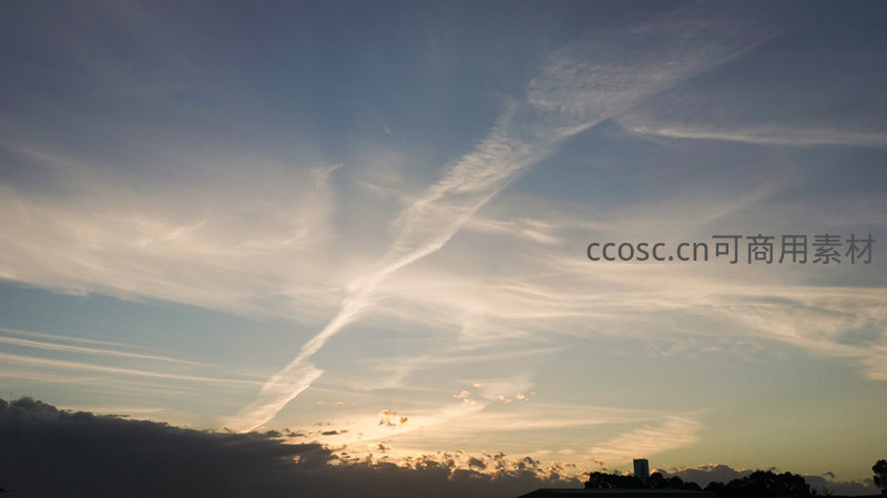 夕阳西下云霞满天,城市剪影静谧如画