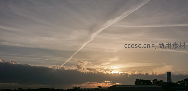 暮色渐浓,天空中云层被夕阳染成金黄,一道长长的云迹划过天际,城市建筑在远方若隐若现,营造出静谧而深远的视觉意境。