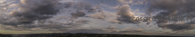 从高空俯瞰,城市边缘的住宅区与远处连绵山脉在暮色中融为一体,天空布满戏剧性的灰白云团,营造出开阔而宁静的视觉氛围。