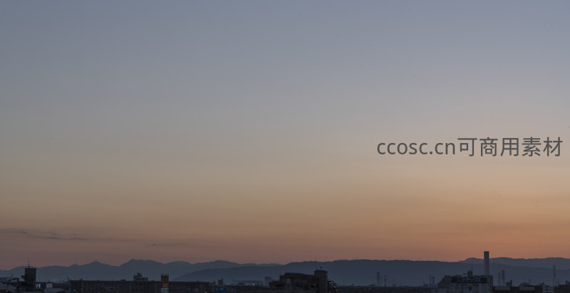 城市建筑群在暮色中静默,远处山脉轮廓清晰,天空由暖橙渐变为深蓝,展现都市与自然和谐共存的宁静时刻。