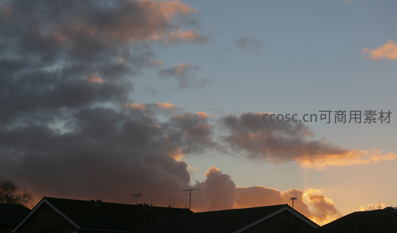 住宅屋顶剪影下,厚重云层被夕阳染成金边,光影交错间充满戏剧性,捕捉日常生活中不经意的壮美天空瞬间。