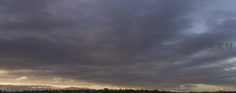 深灰色云层覆盖天幕,地平线透出暖黄夕照,远处林线剪影勾勒宁静黄昏,展现自然光影变幻之美。