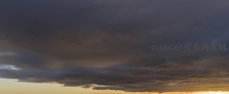 沉甸甸的暗色云层几乎贴着地平线,底部却被夕阳染成温暖的橙黄色,营造出戏剧性的光影对比和宁静而压抑的黄昏氛围。