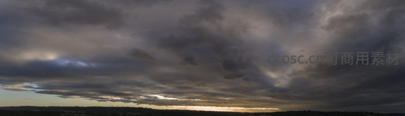 从高空俯瞰,连绵云层如波涛汹涌,夕阳余晖穿透云隙,在地平线上勾勒出明亮金边,城市轮廓隐现于远方,尽显天地辽阔与光影交织之美。