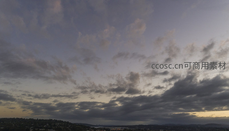 傍晚时分,层层叠叠的云朵在天空中翻滚,远处城市灯光初上,与渐暗的天色交织,呈现一幅诗意的城市暮景。