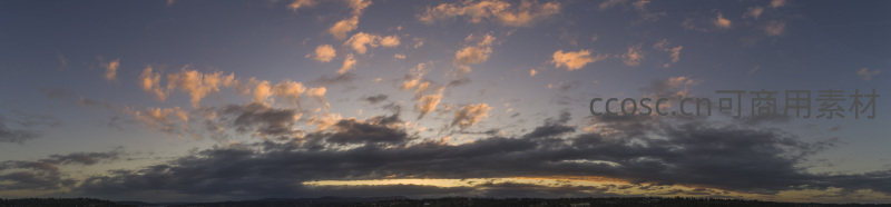 从高空俯瞰,层层叠叠的云海在落日余晖中泛着金红光芒,远方地平线隐约可见城市轮廓,构成一幅恢弘而静谧的黄昏画卷。