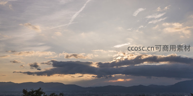 从高处俯瞰,城市轮廓隐于山峦之后,天空被绚丽云霞染成暖金与灰蓝,展现都市与自然交融的黄昏画卷。