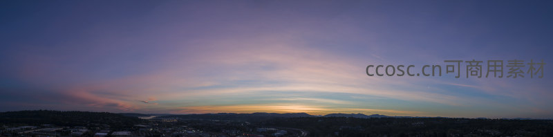 夕阳西下,天空被染成梦幻紫色与橙黄渐变,城市建筑群在暮色中静默,远处山脉与水面倒影交织,美不胜收。