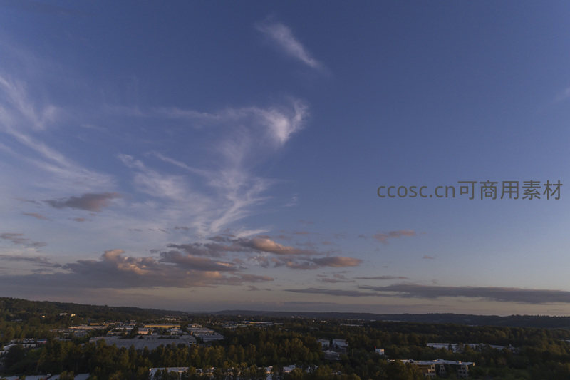 从高空俯瞰,城市建筑群与茂密森林在夕阳余晖下静谧安详,天空中丝缕状的云彩被染成金红,构成一幅宁静而宏大的黄昏画卷。