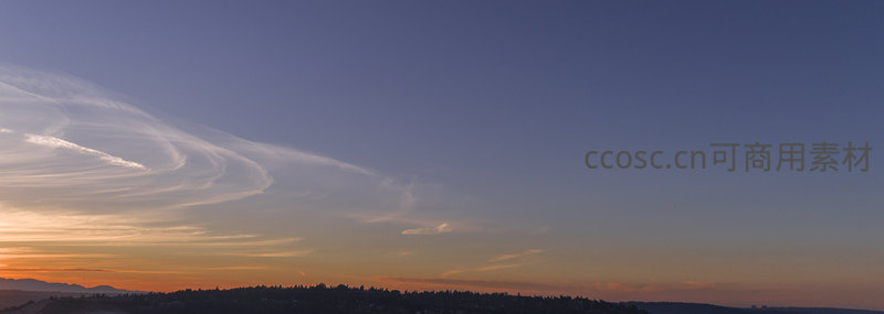 壮丽的黄昏天空中,丝缕状的云彩在渐变的蓝紫与橙黄之间舒展,地平线上的山峦化为深邃剪影,营造出静谧而宏大的自然画卷。