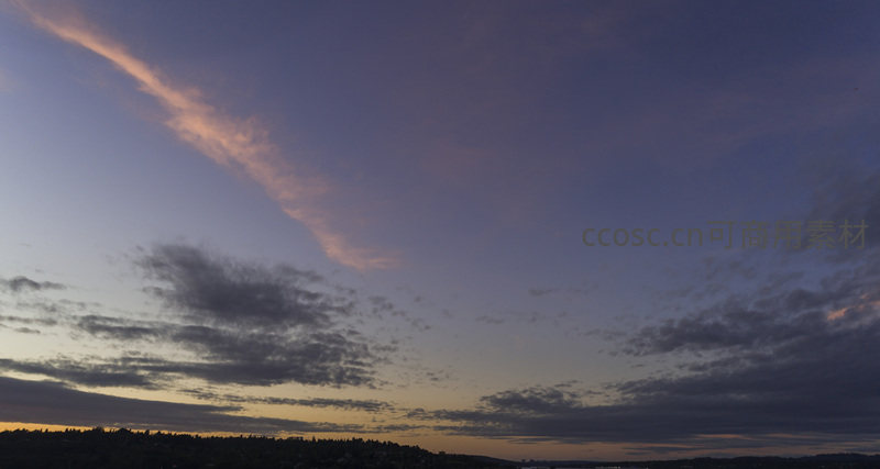 黄昏时分,天空被染成紫蓝与橙粉交织的画卷,云层如丝如絮,温柔铺展,地平线隐约可见山林轮廓,静谧而壮美。