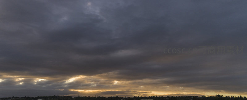 浓重云层几乎遮蔽整个天空,仅在地平线处透出一线耀眼金光,将城市剪影勾勒得清晰可见,展现自然力量与城市轮廓交织的独特美感。