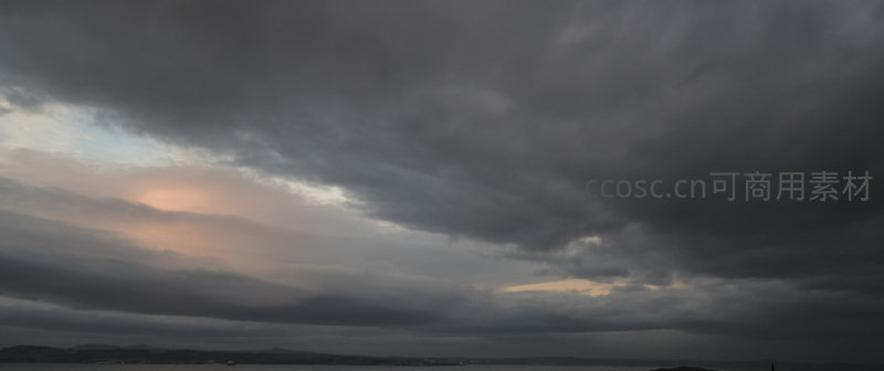 大片乌云笼罩海面与远山,天空呈现压抑的灰黑色调,仅在云缝处透出微弱暖光,预示风雨将至。