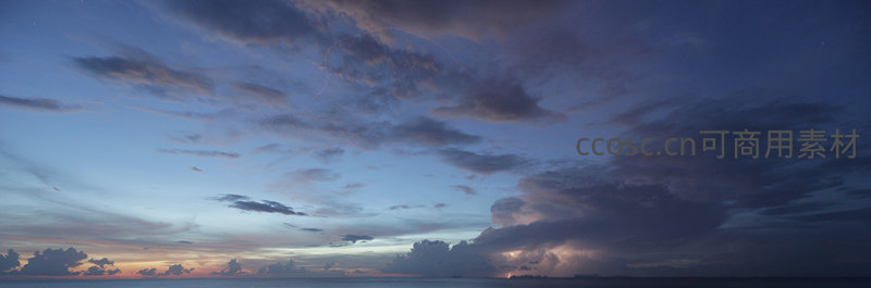 广阔的海平面上空,暮色渐浓,厚重的云层在夕阳余晖下呈现出紫灰与橙红交织的色彩,远处雷电隐约,景象恢弘而静谧。