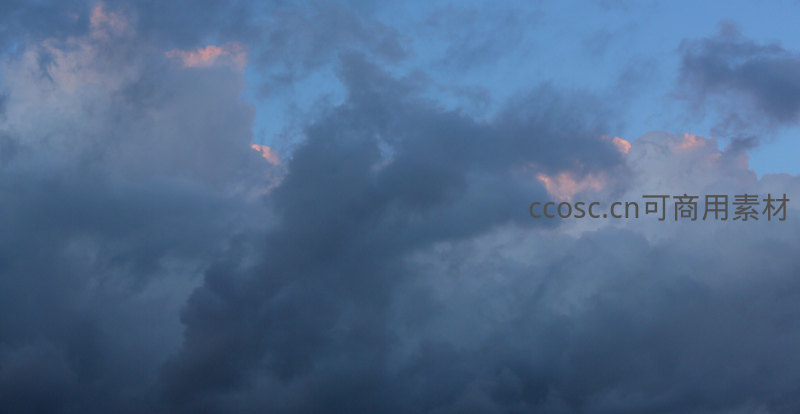 深蓝色的天空中,大片云团堆叠,边缘被落日染上柔和粉橙色,光影交错间营造出静谧而富有层次感的视觉体验。