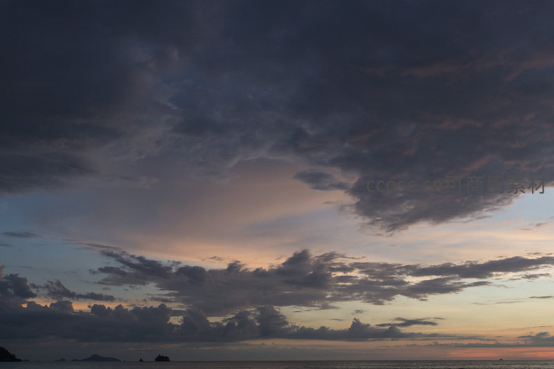 低垂的云层如巨幕般笼罩海面,夕阳余晖穿透缝隙洒下暖光,远处岛屿点缀其间,尽显天地辽阔与静谧。