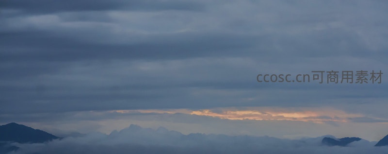 黄昏之际,厚重云层间裂开一道缝隙,金色阳光穿透洒向山峦,云海缭绕山脚,天地间弥漫着温柔而神秘的暮色氛围。