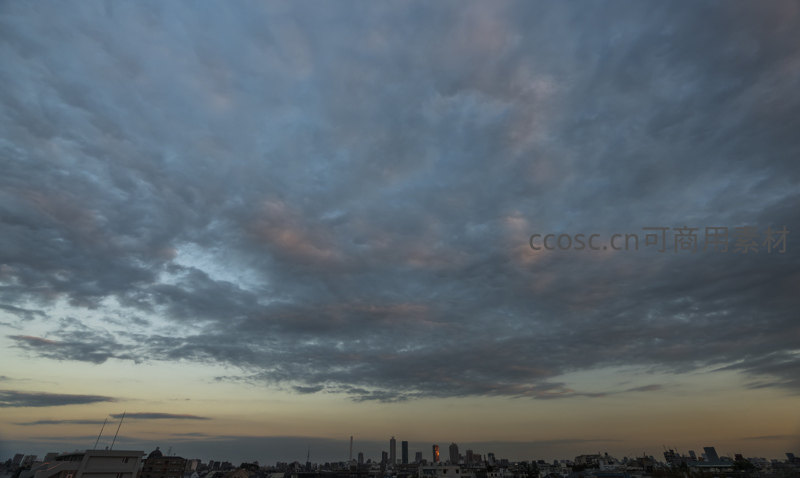 城市高楼之上,大片云层如海浪般翻滚,被夕阳余晖温柔地镀上暖色,构成一幅现代都市与自然光影交融的静谧画面。
