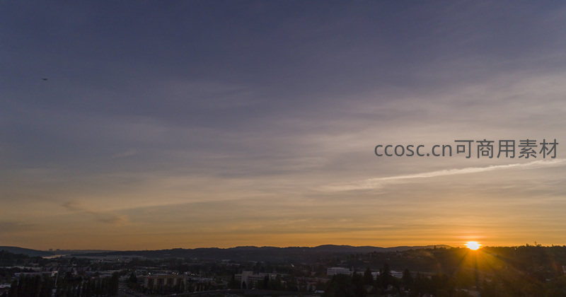 从高空俯瞰,夕阳将城市化作深色剪影,光芒在云层间流淌。远方山丘与近处楼宇形成层次,记录一天落幕前最温暖的光辉时刻。