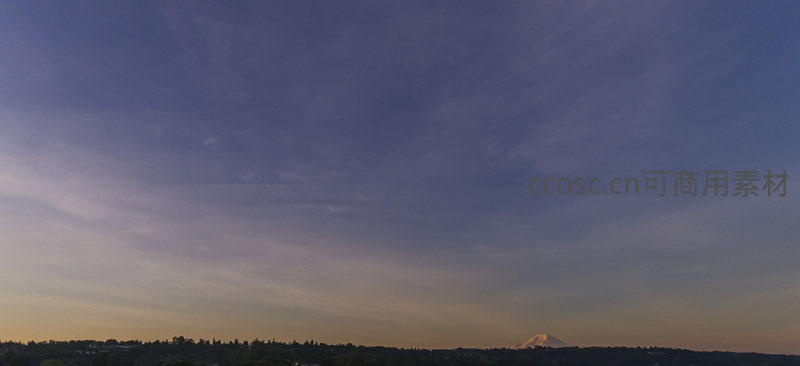 黄昏时分,天幕渐染紫蓝,远方雪山顶峰在余晖中泛着微光,近处林线如墨勾勒,静谧而壮美。