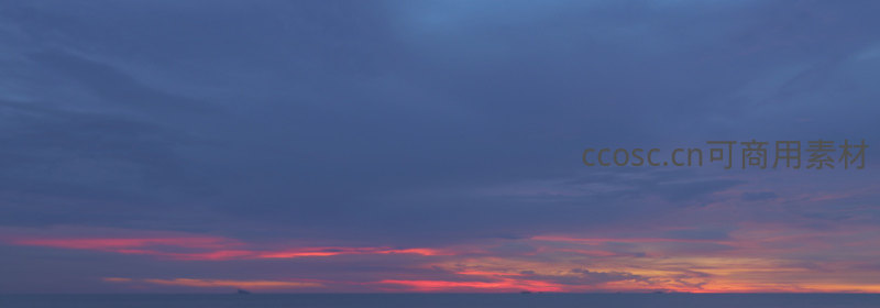 夕阳沉入海平面,将云层染成炽烈的红与紫,深蓝天空与平静海面相接,构成一幅宏大而沉静的画面。
