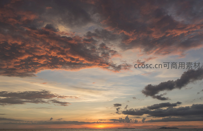 辽阔海平线上,太阳缓缓沉入地平线,将云层和海面染成一片暖色调,构成一幅宁静又恢弘的黄昏交响曲。