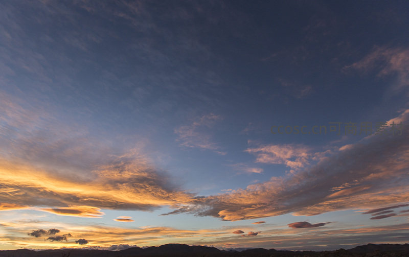 绚烂的晚霞铺满整个天际,云朵形态各异,色彩斑斓,下方连绵的山峦在暮色中勾勒出沉静的轮廓,共同构成一幅宁静而宏大的自然画卷。