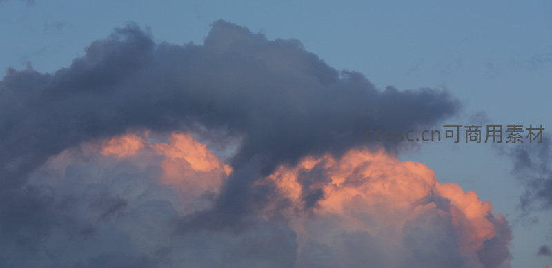 高耸的积云在日落时分被染成暖金色,与上方深沉的云影和淡蓝天空交相辉映,尽显天空的层次与壮美。