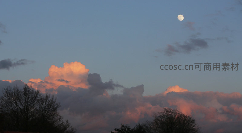 一轮明月高悬于被霞光浸染的云海之上,地平线处树木剪影静默,构成一幅静谧而富有诗意的黄昏画卷。