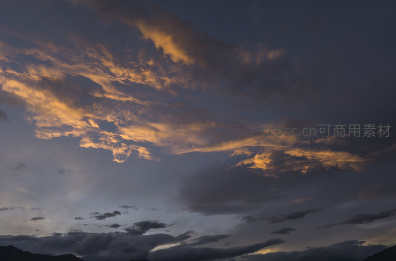 群山之巅,厚重的云层被落日余晖点燃,边缘泛起耀眼的金色光芒,与下方深沉的灰蓝色云块形成强烈对比,展现出大自然瞬息万变的磅礴气势。