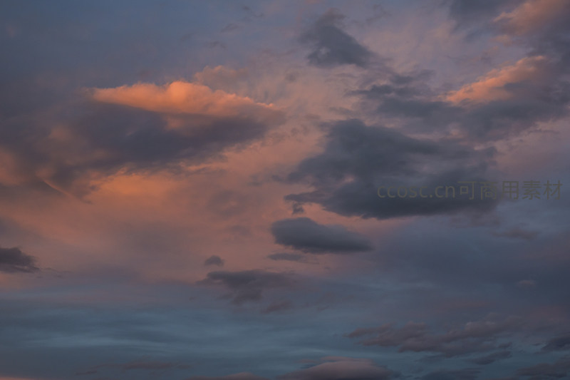 夕阳西下,天空被染成橙红与深蓝交织的梦幻色调,层层叠叠的云朵在光线下变幻莫测,营造出宁静而壮美的视觉盛宴。
