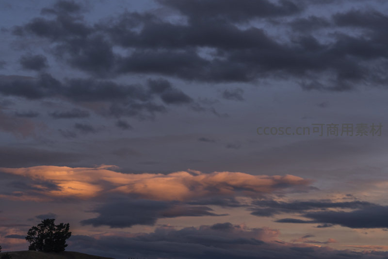 深蓝与橙红交织的暮色天空下,厚重云层铺展,地平线处一抹暖光,孤树静立山丘,勾勒出宁静而壮丽的自然画卷。