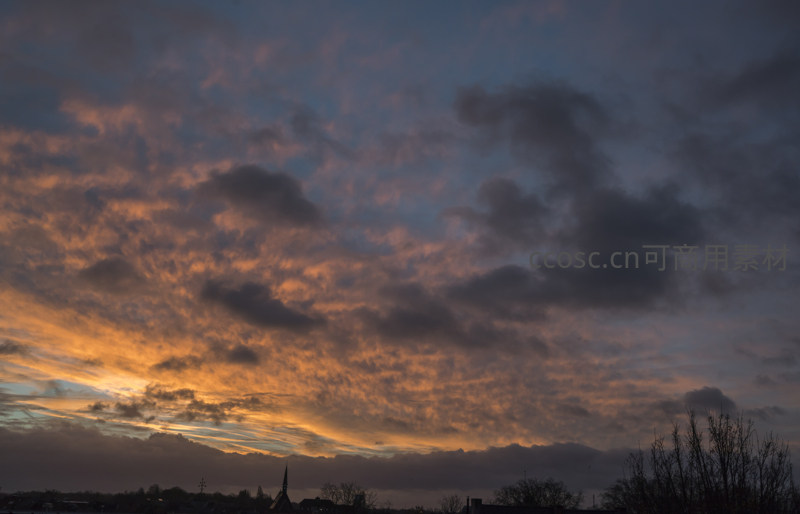 城市轮廓在绚烂晚霞的映衬下化为剪影,教堂尖顶与枯枝点缀其间,天空被染成金橙与紫灰的渐变,展现都市与自然交融的诗意时刻。