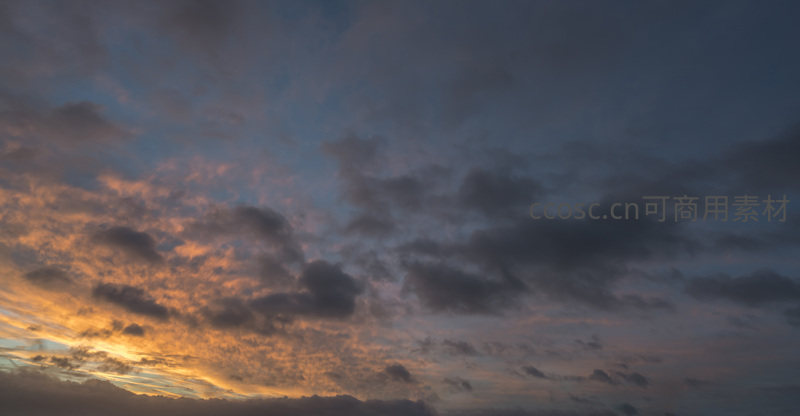 天空被夕阳染成金红与深蓝交织的壮丽画卷,厚重云层在光线下层次分明,展现大自然瞬息万变的色彩魔法。