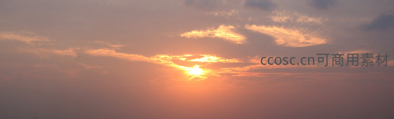太阳在云层间若隐若现,橙红色光芒染遍天际,云朵边缘被镀上金边,营造出宁静而壮美的黄昏景象。