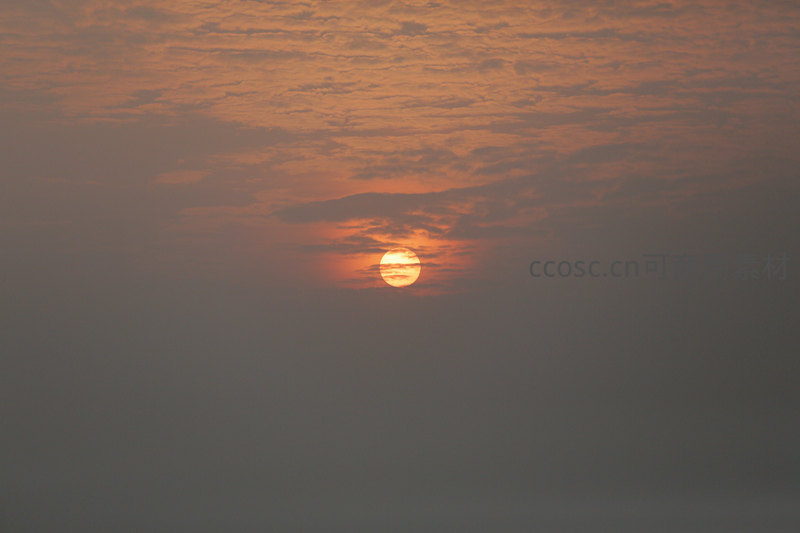 太阳缓缓下沉,被层层云朵半掩,橘红色光芒弥漫整个天空,营造出温柔而略带忧伤的黄昏氛围。