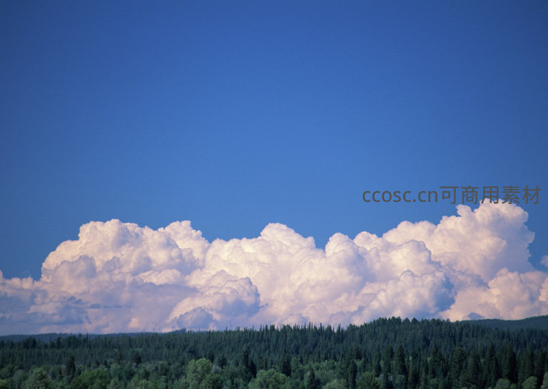 茂密的针叶林带横亘于画面底部,上方是连绵起伏、洁白如棉的庞大积云,蔚蓝天空为背景,尽显大自然的雄浑与静谧之美。