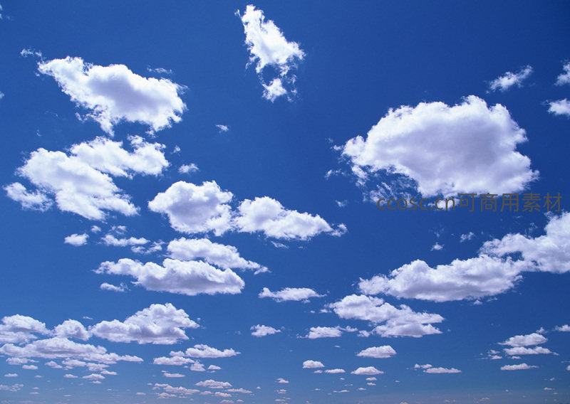 在清澈无垠的蓝色画布上,形态各异的白色云团如棉花糖般轻盈点缀,营造出纯净美好的视觉享受。