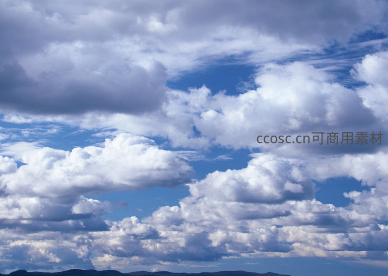 蔚蓝的天空中漂浮着形态各异的洁白云朵,层次分明,光影交错,远处山峦若隐若现,构成一幅宁静而壮美的自然画卷。