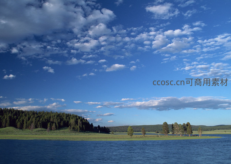 平静的湖面如镜,倒映着蔚蓝天空和变幻的云朵,远处是郁郁葱葱的森林和草地,营造出一种平和而深远的自然意境。