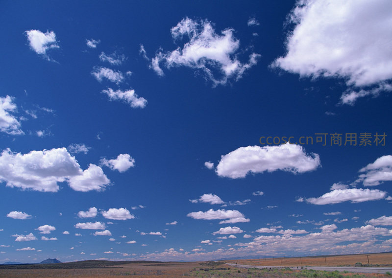 在无垠的棕色荒原之上,一片纯净的蔚蓝天空布满蓬松的白色云朵,远方地平线上隐约可见山脉,尽显大地的辽阔与苍茫。