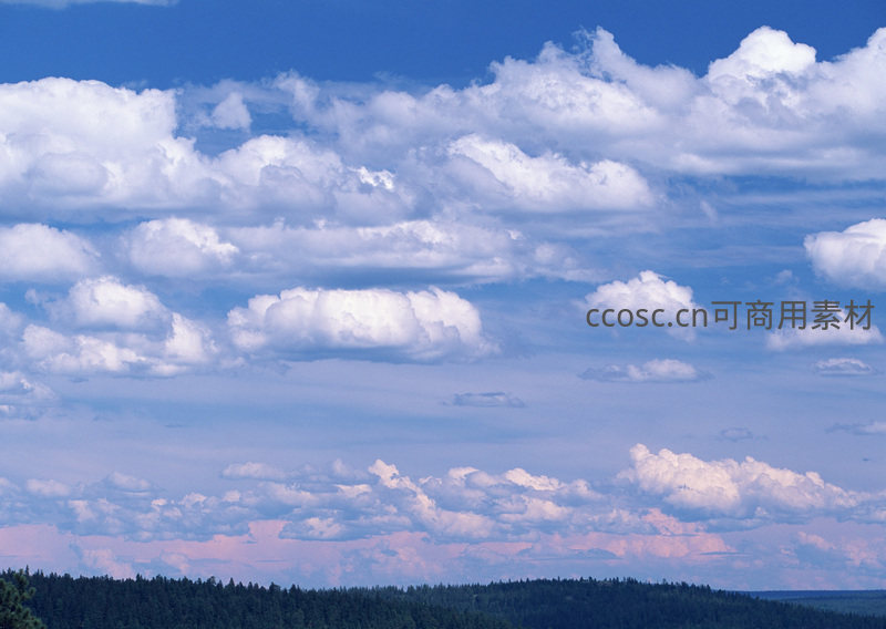 蔚蓝的天空中漂浮着朵朵洁白蓬松的云彩,下方是连绵起伏的深绿色针叶林,构成一幅宁静壮丽的自然画卷。