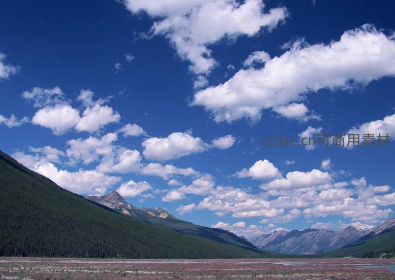 远处巍峨的雪山与近处铺满粉紫色野花的湿地相映成趣,头顶是广阔无垠、点缀着棉花糖般云朵的湛蓝天空。