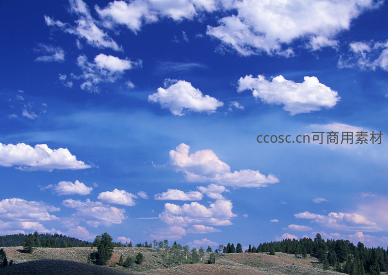 广袤的草原和低矮的丘陵上点缀着稀疏的树木,上方是纯净的蓝色天空,几朵悠闲的白云为大地增添了几分诗意。