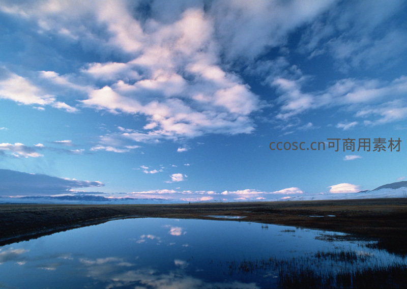 高原上的静谧水洼完美倒映着天空中粉蓝交织的云朵,远处山峦朦胧,整个画面如梦境般宁静而富有诗意。