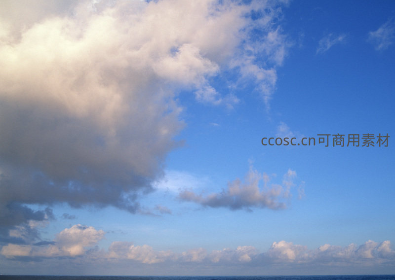 湛蓝的天空与平静的海面相接,蓬松的云朵在夕阳余晖中变幻着柔和的光影,营造出一片宁静祥和的氛围。