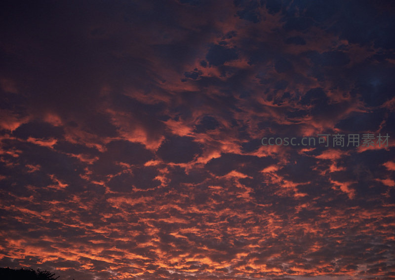 夕阳西下,整片天空被浓烈的红色和橙色云层覆盖,如同燃烧的火焰,带来强烈的视觉冲击和戏剧性美感。