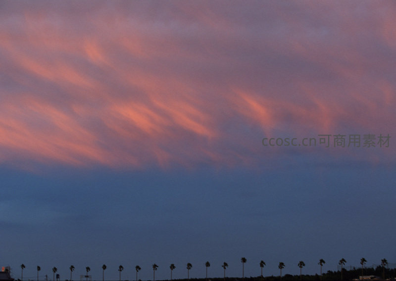 粉紫色的云带横贯天际,下方是整齐排列的棕榈树剪影,构成一幅充满热带风情的黄昏美景,宁静而浪漫。